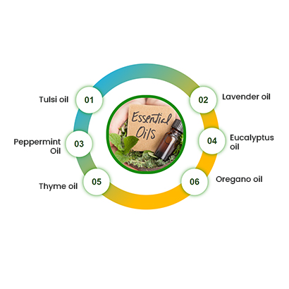 Essential Oils Thyme oil,Oregano oil,Ajwain Oil,Basil Oil,Boswellia Oil,cardamom Oil,Cinnamon Oil ,Clove Oil,Corriander Oil,Eucalyptus Oil,Fennel Oil,Lavender Oil,Neem Oil,Marigold Oil,Pepper mint oil,Rosemary Oil,Sage Oil Skin health, Immunity, Anti-Acne, Respiratory, Anti-inflammatory, Gut health, Anti-microbial, Hair care